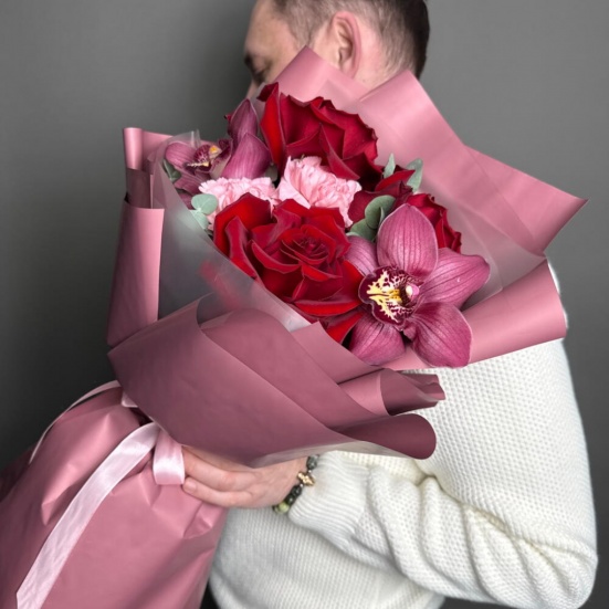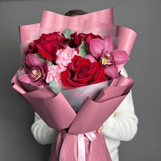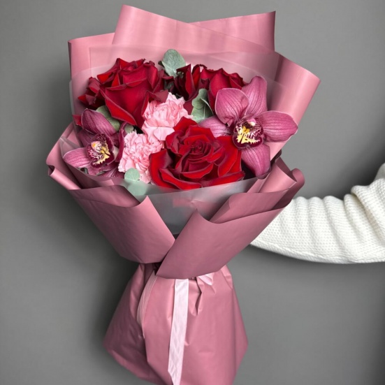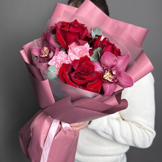 Букет из 3 красных роз, орхидей и диантуса в Оренбурге